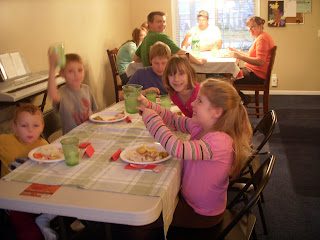 Everyone enjoying their Thanksgiving feast at both the kids table and adults table.