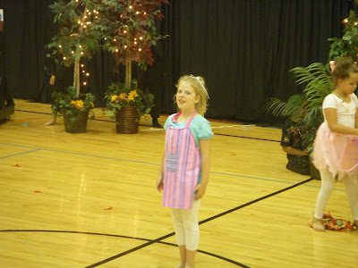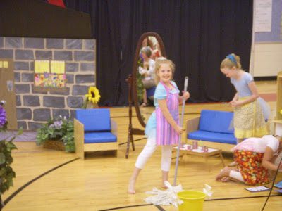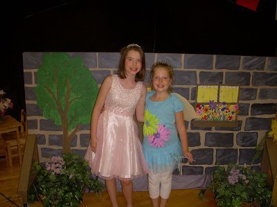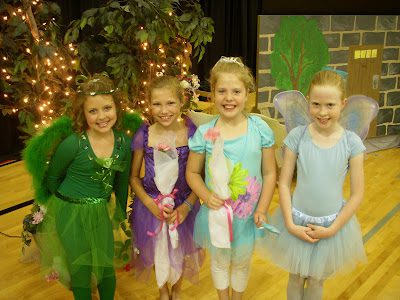 Merinda had fun playing Merryweather (the blue fairy) in this year's K-3rd grade drama production of Sleeping Beauty. Here she is standing next to some of the other fairies, including Flora and Fauna.