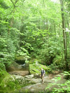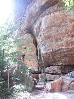 Breck standing at the bottom of the gorge.The cliff-sides and hollows were incredibly green with trees and shrubbery that served as an umbrella to everything below. The river beds contained abundant amounts of fish including largemouth bass, and freshwater mussels.