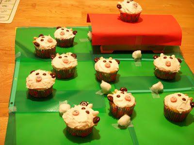 Aubrey threw a surprise party for one of her friends and made these little cow cupcakes, her other friend said she would provide the pasture which, as you can see, included a wooden box covered in red construction paper representing the barn, and cotton balls taped to green page protectors representing bails of hay and grass--totally random, but so cute!