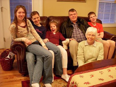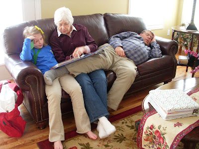 Here, Merinda is looking at her scrap book with Grandpa's new wife, Virginia. The random (and beautiful) part: having a new Grandmother, two new Aunts, and five new Cousins, all sealed to us! (I think Grandpa needs a bigger couch to nap on!).