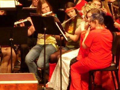 Here is Aubrey playing her flute. She was a Ceiling "Fan" (she has pom-poms in her back pockets).