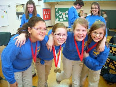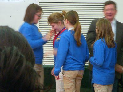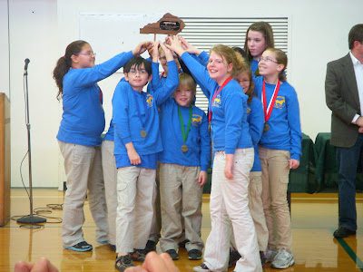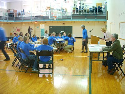 Merinda's team did well during the season, but the real competition begins with the District Competition. Here the team is getting a little pep talk from one of their coaches. The thing I most proud of is that Merinda was the only girl out of all the quick recall teams.