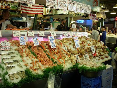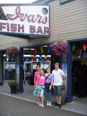 Brad could not make it to the Farmers Market fast enough to eat the Clam Chowder from "Ivars". I have to admit that it was pretty darn good, and made me (who doesn't like sea food) even miss the taste of fresh seafood. Aubrey however, ordered the "chicken" and chips (we told her that was pretty sacrilegious).