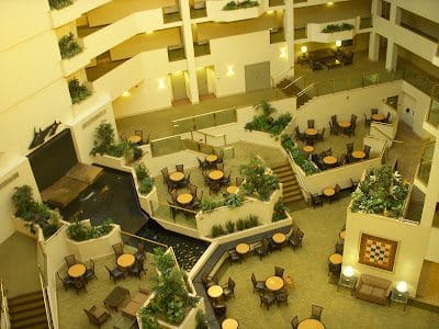 and here is the view from the eighth floor looking down on the breakfast area. I am just glad that we didn't have to pay for this hotel (thank goodness for Marriott Reward points!).