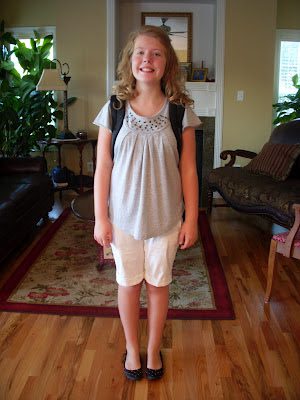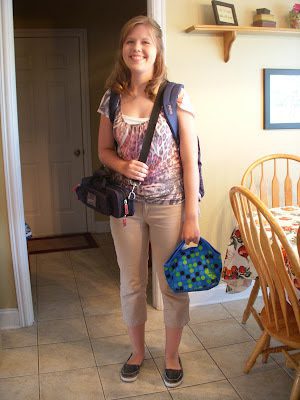 I just had to take a picture of Aubrey loaded down with her school gear. The lunch, flute, and whatever else in front is actually used as a counter-weight for her backpack (which is still about 100 lbs heavier than everything else).