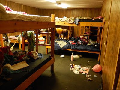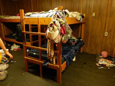 The cabin was completely disgusting and smelly with wet clothes, shoes, and towels thrown amongst spilled juice, chewed up candy, and camp paraphernalia.