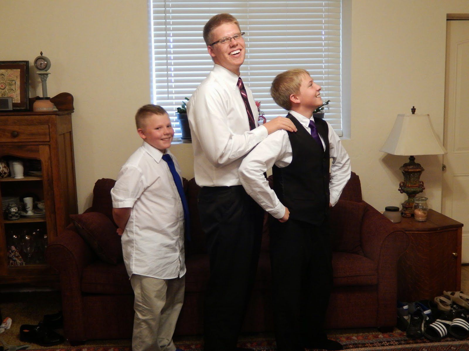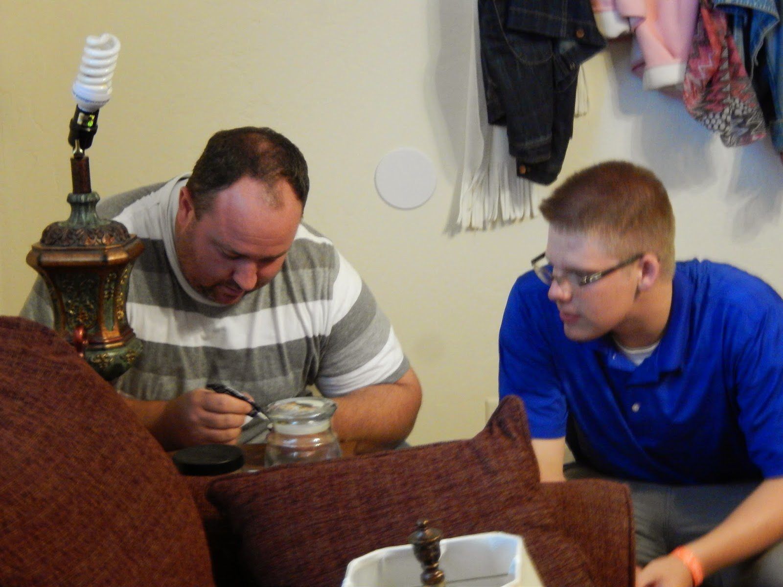 Our first night at Mom's house Melanie and family came to visit because "they can" (they just moved to Utah a few weeks earlier). Uncle Eric helping Breck fix one of Mom's lamp that he knocked over.