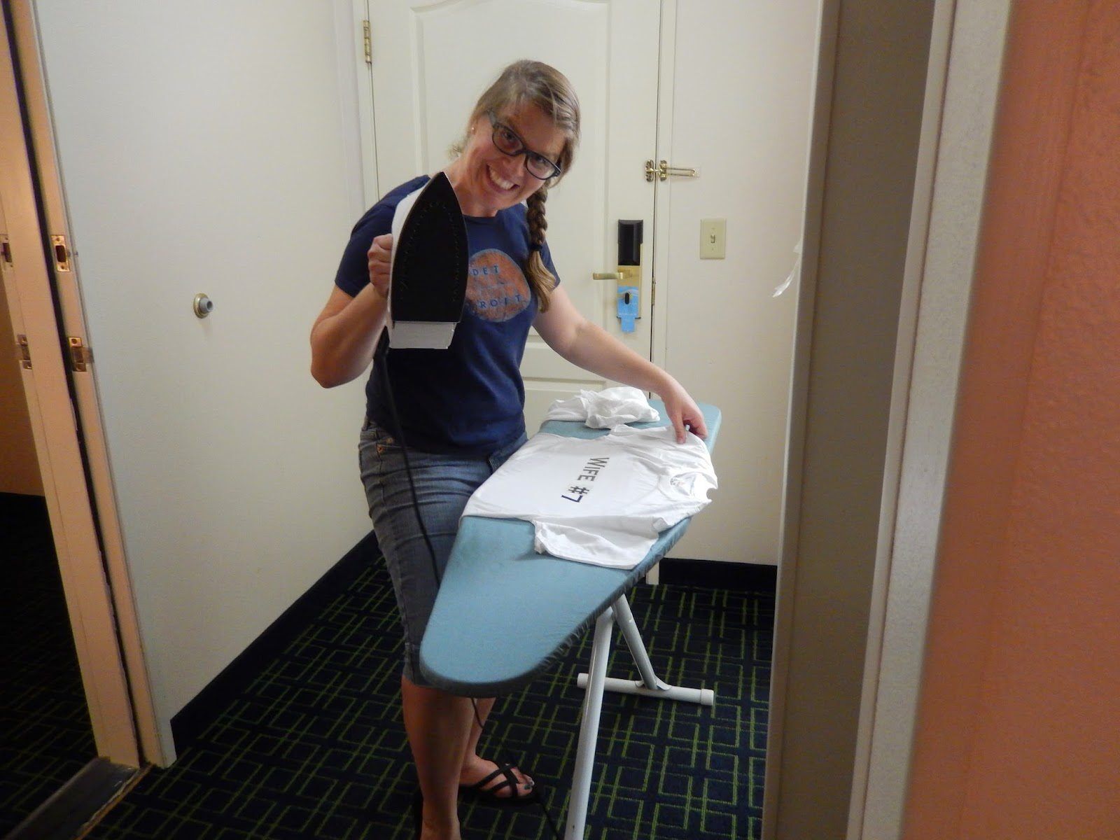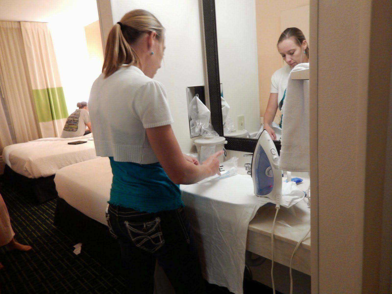 Heather and Vicki ironing our "costumes" (entirely too late the night before our race). That's okay because Natalie and Randi didn't get in until 1:30 am. Not too bad unless you're waking up at 4:00 am!