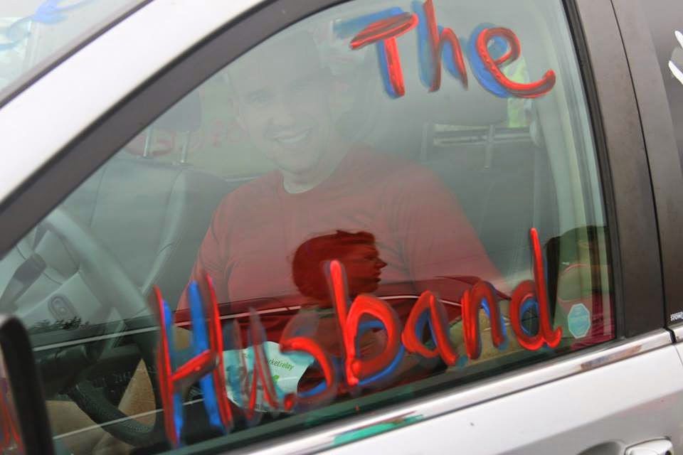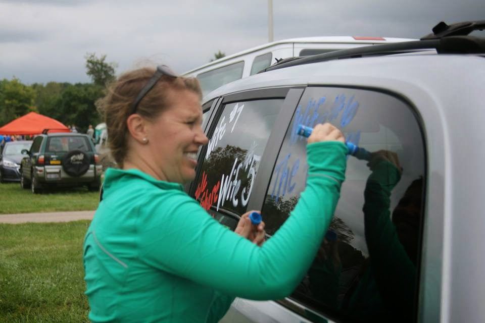 Vicki, our fearless leader, decorating the van (for the "best decorated van" contest).