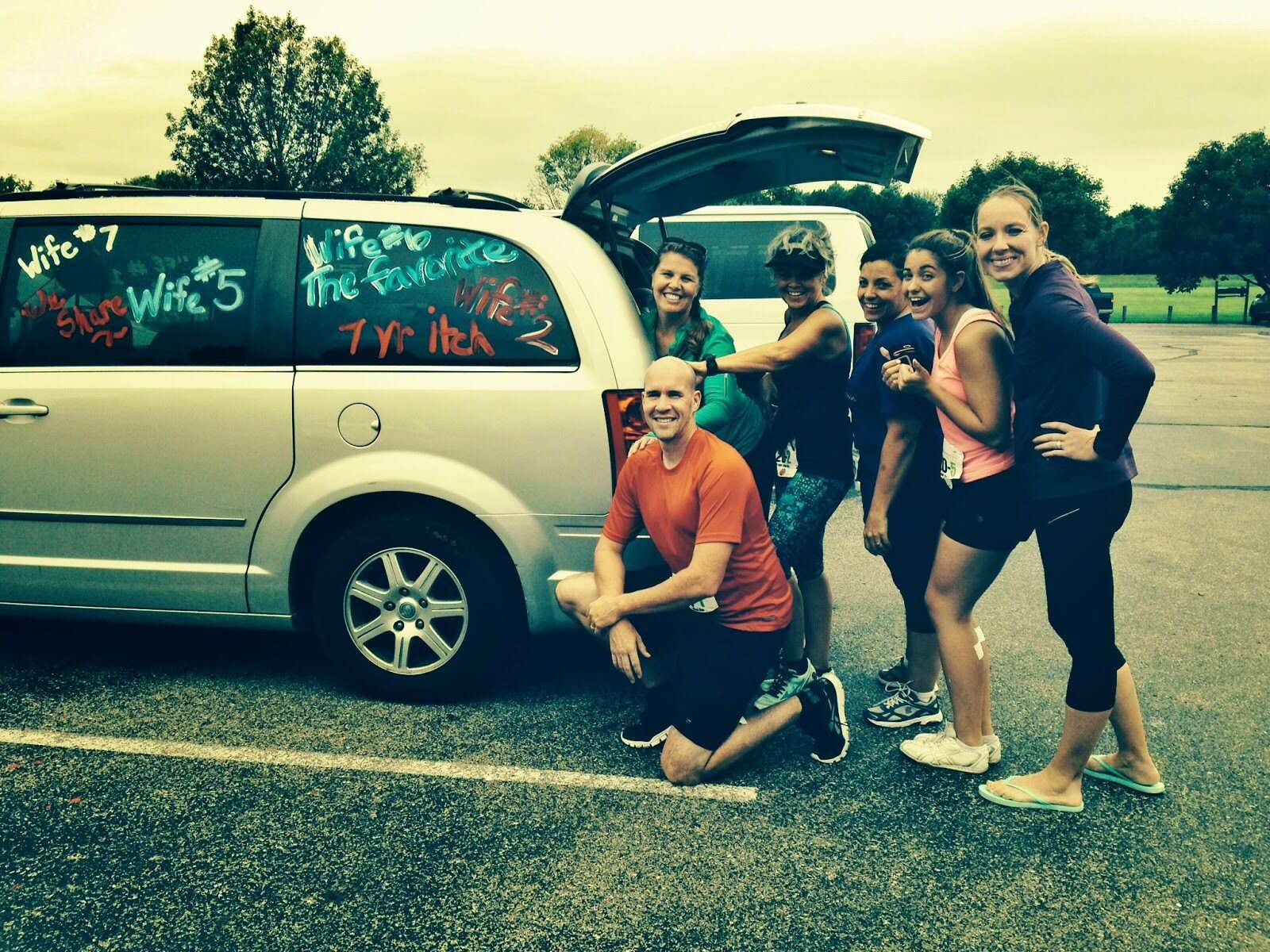 my teammates were taking pictures in their matching shirts, or costumes, in front of our epic van,