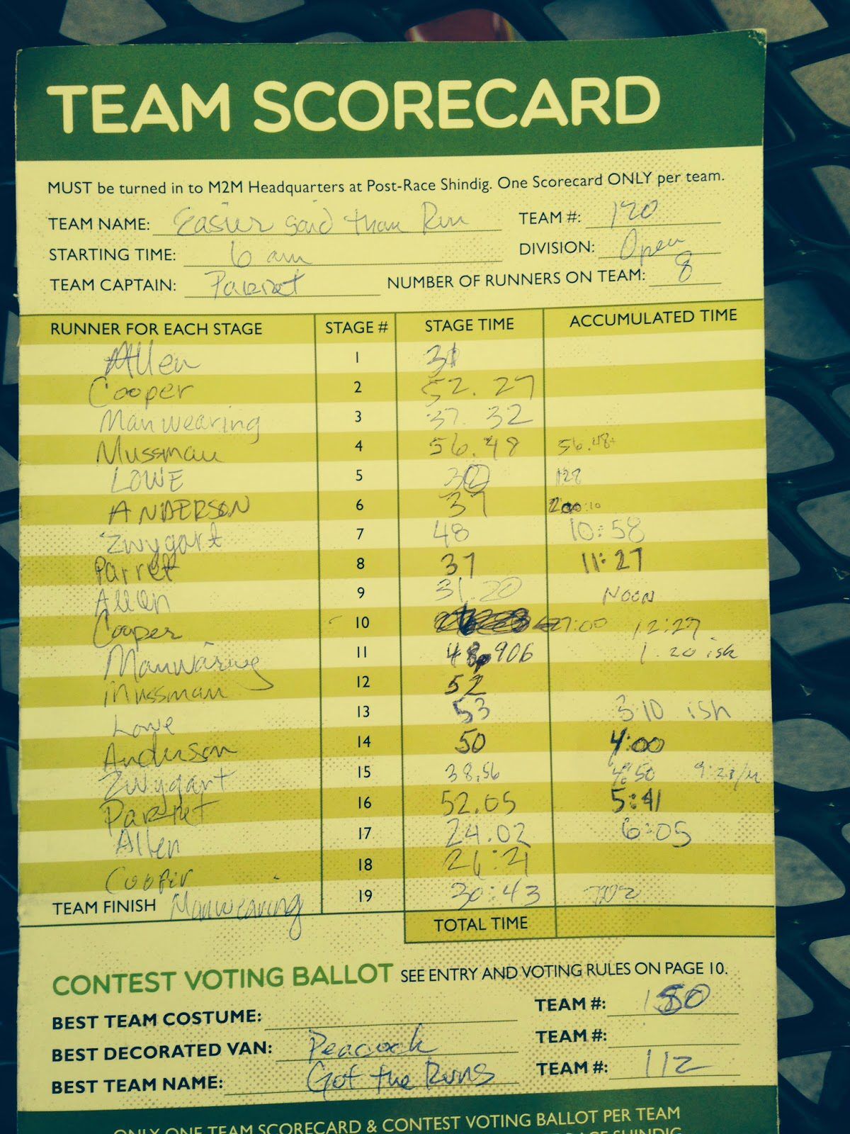 Team picture under the starting gate. Because of our pre-race beginning and intermediate running times, our team was given the 6:00 am start time, as apposed to other teams that had the 8:00 am start time. In fact, the race coordinators were a little concerned we might not finish at all, or at least before dark. So we made that our goal--to try and finish before dark, or hopefully sometime between 8:30 and 9:00 pm.