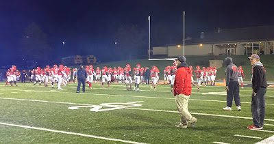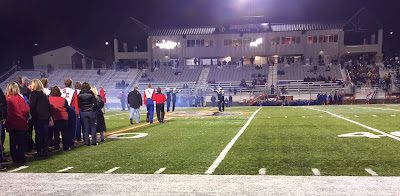 This is the view of the stands as we were waiting our turn to walk down the field with Breck. The part of the stands that actually has people, is the rest of the band kids. The reason why - it was about 32 degrees! I guess you can say we are a school of fair weather fans.