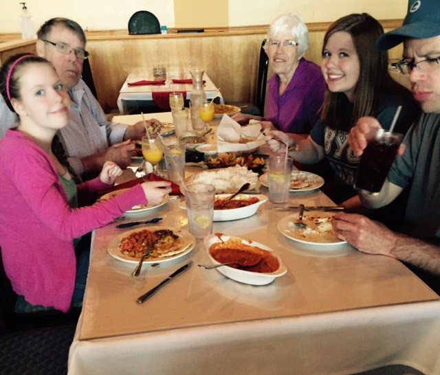 and enjoying Indian food with Grandma Virginia and Grandpa Manwaring.