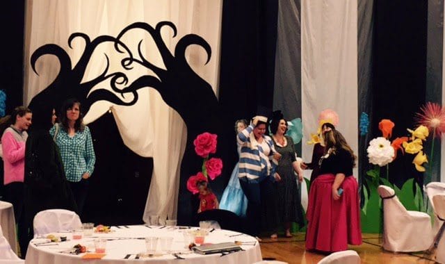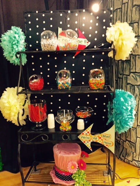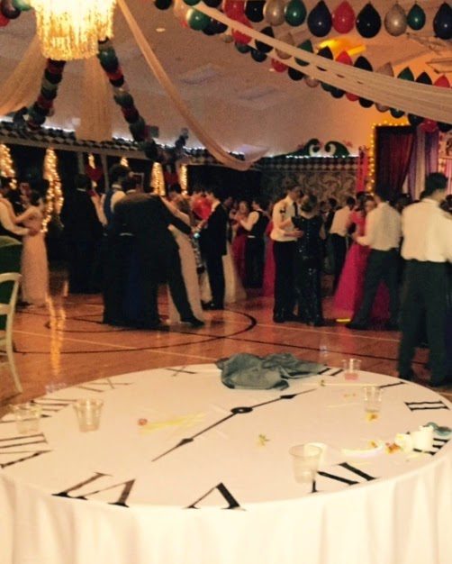Each table was a time-watch, and the eye-catching chandelier was made out of hula-hoops and streamers.