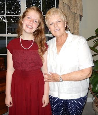 Merinda with Grandma Heelis, who sewed pleats in the back of her beautiful graduation dress (she got from Aubrey) so it would fit properly.