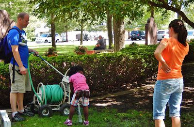 The joys of vacationing with younger kids - Brady and Antoinette hosing off their daughter after she fell in the mud.