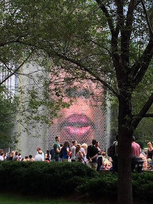 Huge images of Chicagoan's faces periodically changed and poured water out of their mouths at Crown Fountain.