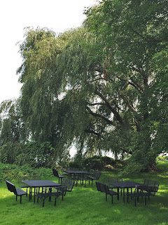 Picnic area, under the trees, close to the water.