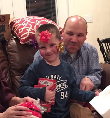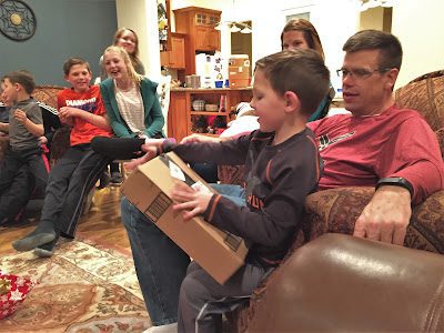 Brad helping Tyson unwrap the gift he picked,