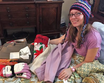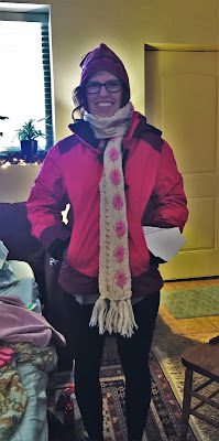 and me modeling my hand-made hat, scarf, and new winter jacket, all from Mom.