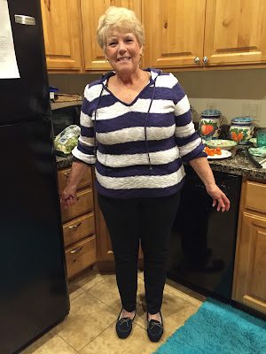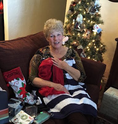 Mom modeling her new sweater and slippers from Melanie and family.