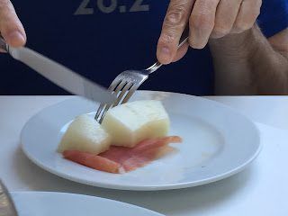But the appetizer of fresh melon and ham (the thin salty kind) and dessert of lemon and chocolate cake made the meal!