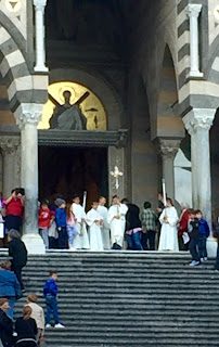 and huge! This church sprang up out of Amalfi's main shopping square called the Piazzo del Duomo, like a mountain, and it was a site to see! It's a 9th century Roman Catholic cathedral (Duomo) with adjoining Basilica (Church) of the Crucifix.