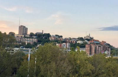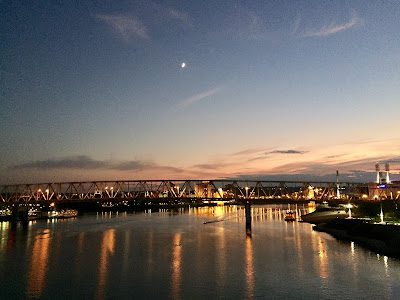 Ohio River, city lights, and small crescent moon.