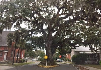 This Spanish Moss tree in the middle of the street is named Kate's Tree, after Kate protected it from being cut down by holding a shotgun while sitting on her veranda.