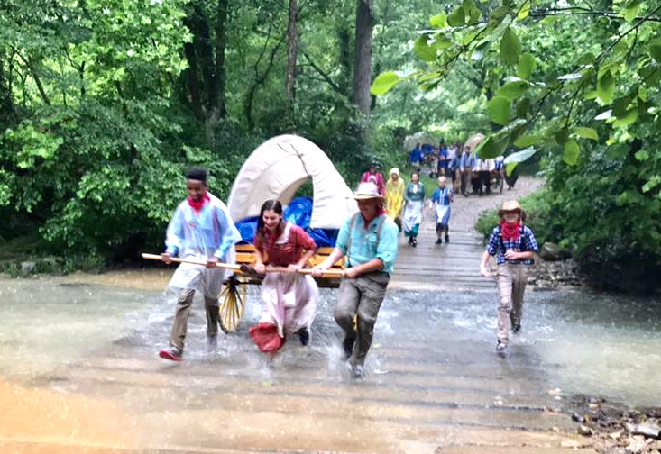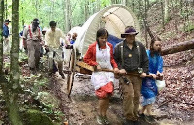 Merinda's family with Rex keeping the wagon steady on a mud slide.