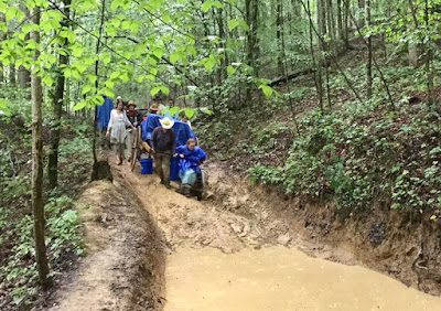 Merinda in the green poncho bringing up the rear. Merinda hurt her foot, but was a trooper and finished the ten miles the first day.