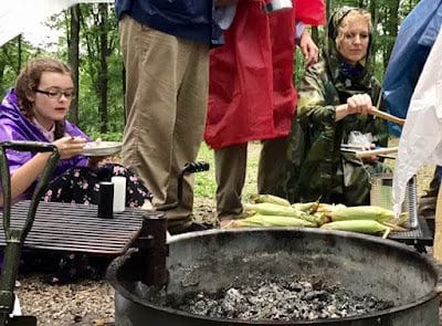 Bridgette trying to cook in the rain.