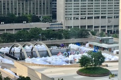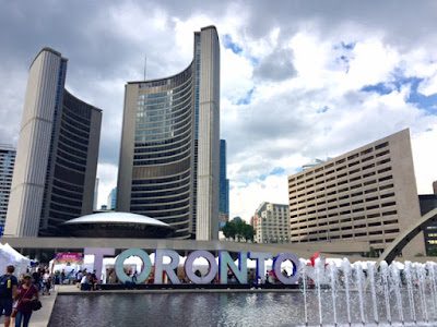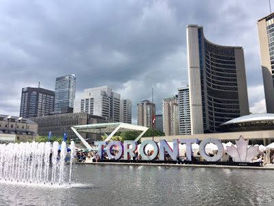 Canada's largest city square, Nathan Phillips Square, includes a 3D sign of Toronto (that flashes multiple color schemes) with New City Hall as the backdrop.