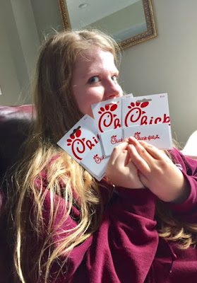 The next day, on her actual birthday, our good friends the Holts, saved the day by taking her out to eat at her favorite restaurant (where else but Chick Filet!)