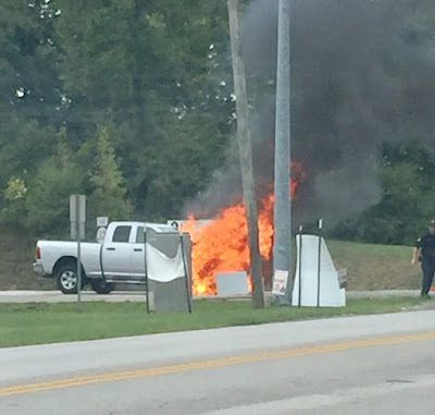 and a burning truck in front of the high school.