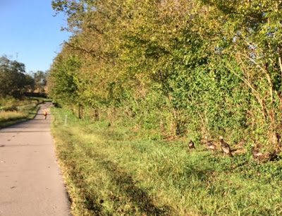 four wild turkeys on my morning run (blending in on the right),