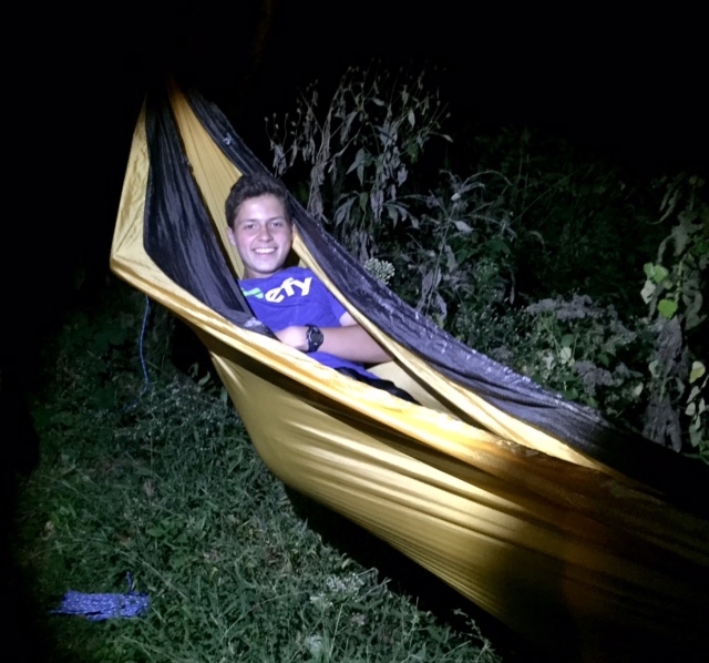 Austin was a happy camper once the hammock was all set up (in a safe place), and ready to be slept in for the night.
