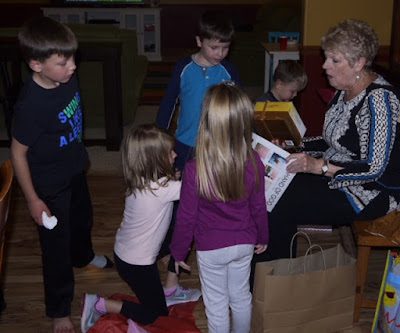 Mom opening her gifts with some help from the grandkids (Matt, Melanie, Sasha, and Saul's kids).