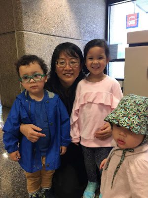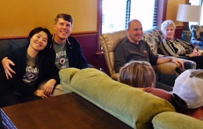 The kids (Sasha) threw Mom a birthday party at Sasha and Chris' house (Jared & Mia, Chris, Mom, Matt & Brei).