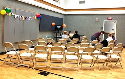 We then set up the TV, chairs, snack table, and a few decorations in the back of the cultural hall (that sounds so much better than "the gym").