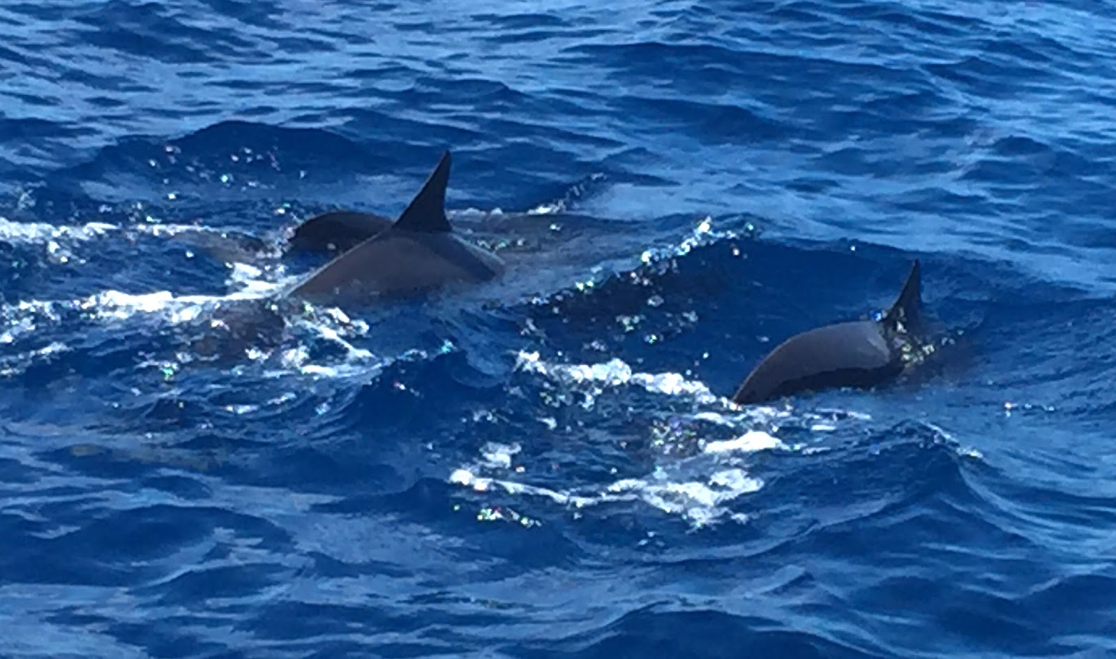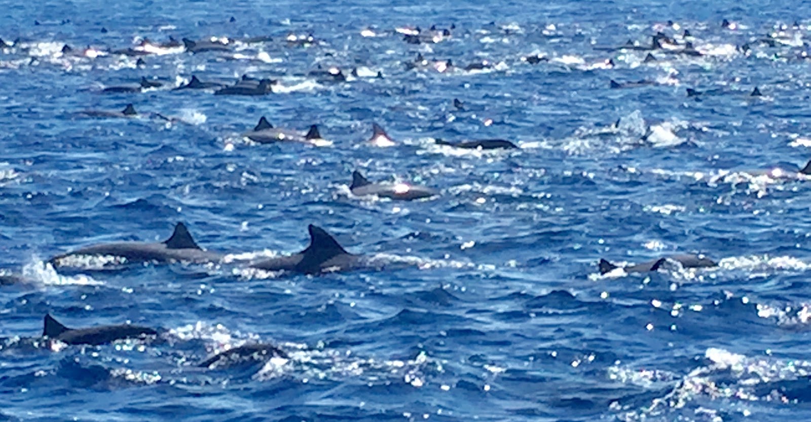After heading out to sea for an hour-and-a-half, they finally reached their fishing destination, which was right in the middle of some kind of dolphin feeding ground.