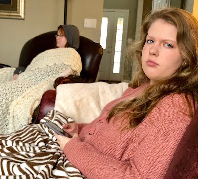 And this was how we watched General Conference! We invited Katie from our Ward (a fairly new member) to watch General Conference with us so she came for both Sunday sessions. We also invited Katie, and my friend Bea, to eat Easter dinner with us which included smoked Salmon, compliments of Brad! (And yes, it was that cold in our house...it's called a heat pump for those of you who know what that is!)