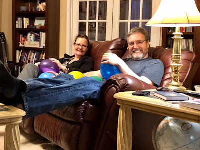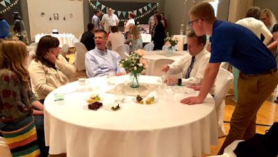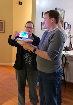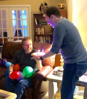We then sang happy birthday to Les as Tyler and Debbie put a flashing cake topper and candle on his "cake"