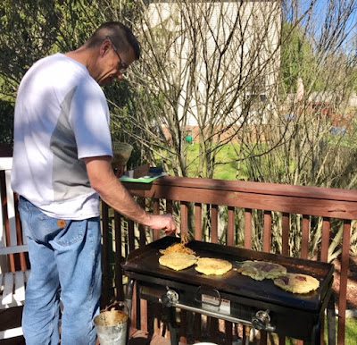 Brad grilled some Okonomiyaki's (okonomi means "how you like" and yaki means "grill") or savory Japanese pancakes made with shredded cabbage and bacon.