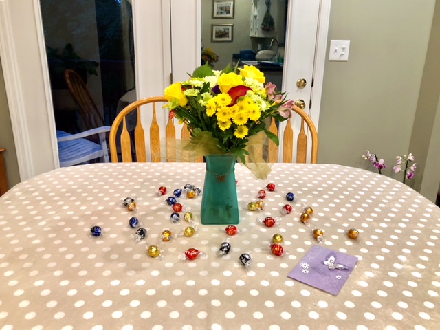May also includes Brad and my anniversary. Unfortunately, Brad was out of town on business so he had a little helper (Breck) get flowers, chocolates, and a card, and place them on the kitchen table so that I would see them the morning of our anniversary. It was a very nice surprise and made me realize how lucky I have been to be married to my best friend for the past 27 years!