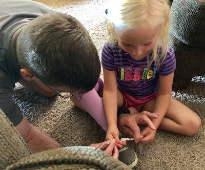 Brad teaching Emma how to tie her shoes