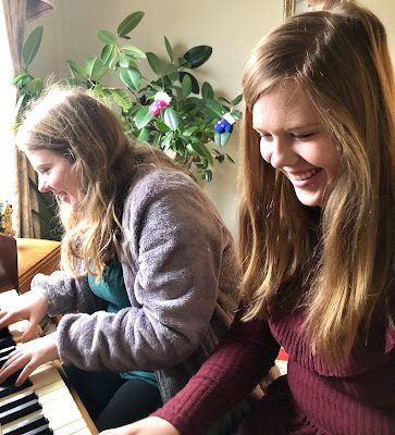 Merinda and Aubrey playing a Christmas duet on the piano.