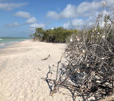 One morning when I walked the beach to its end, I came upon a bunch of shrubbery that people had decorated with all types of shells.