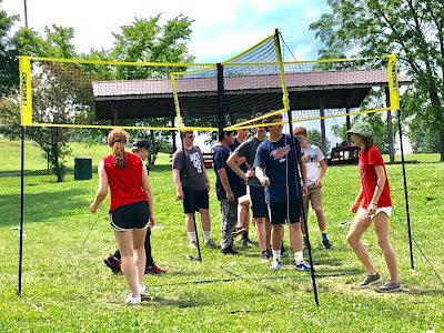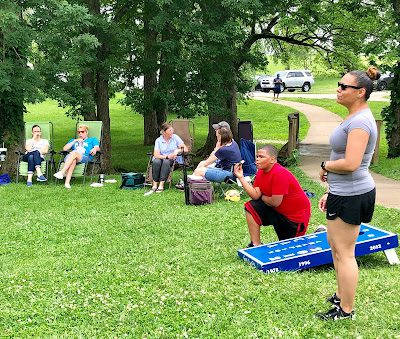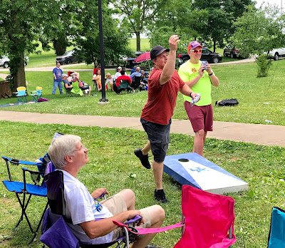 Thoney Charles watching Rex Holt and Rich Risher play an intense game of corn-hole against ...